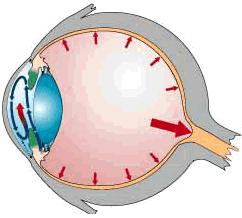 Kod normalnog, zdravog oka, stanice cilijarnog tijela neprestano izlučuju tekućinu koja vlai očnu leću, arenicu i ronicu , a ima i metaboličku ulogu.Ona se zove očna vodica i otječe iz oka kroz komorični kut.To je sloena mrea tkiva na spoju arenice i ronice. Smatra se kako u mnogim slučajevima otećenje očnog ivca nastaje zbog povećanog tlaka u oku, koji je rezultat nakupljanja spomenute tekućine u oku i nemogućnosti normalne drenae oka. Međutim, otećenje ivca ponekad se javlja i kod osoba koje nemaju povećan očni tlak, pa liječnici vjeruju kako je glaukom bolje definirati kao neurodegenerativnu bolest, a ne samo kao bolest visokog očnog tlaka.